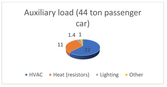 In railways, the electrical load in passenger units (coaches in conventional trains) are due to lights, ventilation, heating and air conditioning, information screens, opening and closing of doors or grills and cooking in bistro and restaurant cars. These ancillary loads are also referred to the technical literature as “hotel loads”. UIC estimates that the amount of energy needed for hotel loads ranges from 10–15% up to nearly 40–50% (in some cases) of the overall demand of the train [1], see also Figure 2. In [24], authors estimated main auxiliary loads for standard coaches of the Spanish operator (RENFE) in 1980 and 90 (series 9000 and 10,000), see Figure 7. These series are very close to the 42 T European Standard Coaches class called “Eurofima” (European Company for the Financing of Railroad Rolling Stock) delivered in the late 1970 s and refurbished in the 2000 s. Some of these coaches, due to their performance, are still in service in many countries, being used for IR and IC services.
