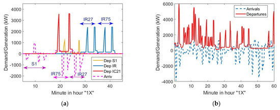 A timetable for a medium-size passenger station, Luzern (CH), is shown in Table 1, with traffic around 100,000 pas/weekday. Table 1 depicts arrivals and departures. Logically, trains apply regenerative braking to the overhead line of RPS (15 kV 16.7 Hz, in this case) whereas some other trains leave or are ready to leave in the very-short term, demanding load for auxiliary services, for example, the heating of coaches, or to accelerate. The main characteristic of this timetable is that it is basically the same for every hour from 6 a.m. to 11 p.m., although Luzern is not a “full” node of the Swiss periodic timetable. Four railway operators provide passenger services: BLS AG [12]; Südostbahn (SÖB, [13]); Zentralbahn (ZB, [14]); and SBB-CFF-FFS [15]. SBB is the main operator, and it can be considered as a potential railway “demand aggregator” to manage the electricity consumption of its trains (demand, capacity, efficiency and flexibility) both in RPS and PPS.