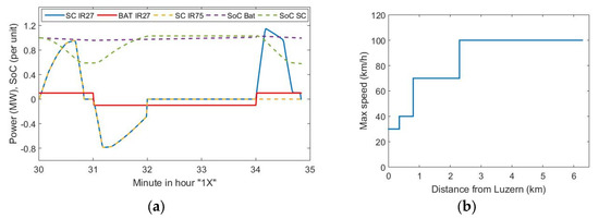 An additional reason to choose Luzern as the simulation scenario is that Swiss railways (in this case, SBB-CFF-FFS) own a small power system (RPS, 600 MW) which includes six hydroelectric power plants at 16.67 Hz (a usual frequency for traction in Central and Northern Europe) which deliver power to railway substations at 15 kV-AC (at 25 kV in some systems). The problem is that this system is not an islanded one because of the growth of passenger and freight traffic in Switzerland. The increased demand in recent decades has involved additional requirements for energy supply by Swiss PPS through seven AC/AC converters (50 Hz to 16.67 Hz) [4]. Average demand reported in the technical literature by SBB operators is presented in Figure 4a. According to the data discussed in [4] demand exceeds 16.67 Hz generation capacity of RPS (around 450 MW) in the morning and the afternoon. These peaks are covered by frequency converters (Figure 4a, dashed lines) and this energy is bought in energy markets.