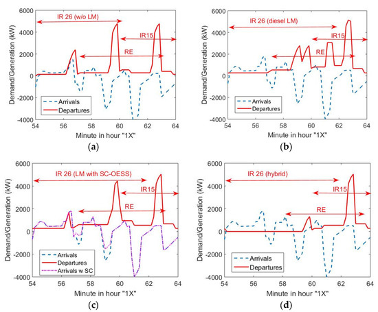 Terminus stations are very usual in England (King’s Cross), France (Paris Montparnasse; Paris Gare du Nord), Switzerland (Zurich Hbf, Luzern), Germany (Munich), Italy (Milano) and Spain (Alicante, Madrid Atocha and Madrid Chamartín). In these stations, intercity and regional trains are parked on the platforms or have arrived up to 10–20 min before they leave the station to allow check-in for travellers or because of transfer requirements with other trains. Moreover, periodic timetables entail that these dwelling times should be known in advance with a high degree of accuracy. In these cases, trains on platforms require power for auxiliary loads and can store energy (from regenerative braking of other units that arrive at the station) or are able to generate some power from OESS. Moreover, dual units (with diesel and electric engines) can generate power similar to conventional DG units, for instance, in the case of diesel-electric shunting locomotives used in terminus stations for the triage of coaches or, alternatively, through some standard diesel-electric locomotives modified and endowed with a pantograph, as proposed in [11].