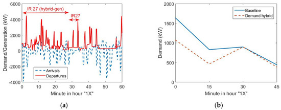 Table 1 also includes the track or platform for the arrivals and departures. This information is of interest because the reader/researcher can foresee if the same physical unit arrives and performs later the same or another service (i.e., if the train is parked in the station, it demands energy for ancillary loads and is available as DER). Timetable planners use a clock for each node (basically a railway station) that represents the arrivals and departures, in minutes, for a specific service (S, RE, IR, IC…). The axis of symmetry of these journeys defines the kind of node (00, 15, 30, 45…). In this case, (Figure 3), some services in Luzern present 00 or 30 symmetries (IR70 and 75, RE), but not in all cases (S1 and especially IC). For this reason, in practice, Luzern is not considered as a conventional nodal point (or an “integrated fixed-interval timetable hub” [5]) for the Swiss periodic timetable system. Forecasts show a horizon of services every 15 min in all the system [22] by 2050 that will probably increase average, oscillations and peaks in demand. This constraint must be carefully considered for timetable planning as it is proposed in Figure 1.
