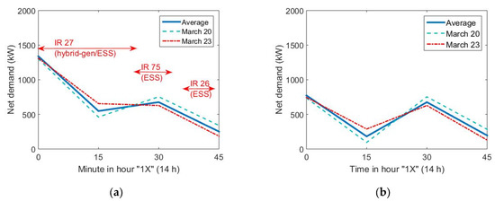 Another characteristic is that the peaks in RPS are quite different from the peaks in PPS. Usually, in RPS, peaks occur for a noticeably short period, typically less than 1–2 min (30, 45, or 60 s) due to acceleration and the tractive characteristics of trains. Those peaks are not shown in Figure 4a because the demand curve in Figure 4a is an hourly curve that “filters” demand changes, but these peaks are important and will be analysed in Section 4 through simulations. Usually, demand peaks appear during peak traffic periods (7–8 a.m. and 6–9 p.m.) and involve changes up and down around 15–25 MW/s (on the RPS), which requires the use of additional power converters to cover these peaks (they are usually more frequent in winter). Demand swings can reach up to 300 MW (RPS) in a 15 min period [4]. Notice that this scenario is worse than power engineers must face in PPS, where infrastructures operate with slower fluctuations of demand. Those fluctuations in power systems explain the interest in DR policies worldwide and make possible the deferral of new and expensive investments. With some adaptations due to the particularities of railway loads, a similar portfolio should be of interest to RPS too.
