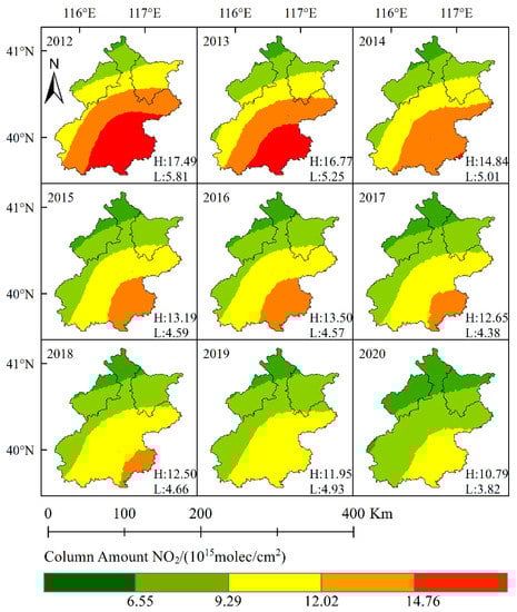 Distribution of the tropospheric NO2 column concentration in Beijing, China between 2012 and 2020 (Annual average value).