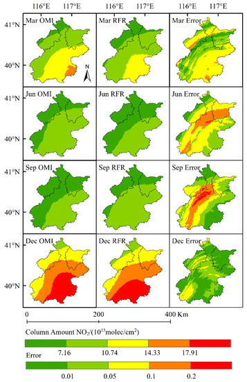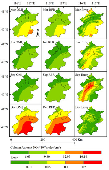 With the development of industries, air pollution has become a problem of increasing concern and aroused widespread attention from the whole of society. Nitrogen oxides are the main air pollutants and are directly or indirectly related to atmospheric environment problems, such as photochemical smog, acid deposition and stratospheric ozone depletion, among others [1,2,3]. NO2 is the main component of nitrogen oxides in the atmosphere, and its monitoring and prediction can, to a greater extent, serve as a guide to the control of atmospheric nitrogen oxides and therefore help formulate policies for their emission, reduction and control. Large numbers of mathematical and machine-learning models have been developed to calculate and describe the distribution and change of atmospheric NO2. Weather research and prediction in combination with the weather research and forecasting community multiscale air quality modeling system (WRF-CMAQ) and weather research and forecasting-chemistry (WRF-Chem) have been used extensively [4,5,6]. Shin et al. (2018) [7] made a linear regression analysis of NO2 in Japanese metropolises using the spatiotemporal random tree model and found that it was advantageous to use this model to simulate spatiotemporal changes of NO2. Zhan et al. (2018) [8] established a new model known as random forest space-time Kriging (RF-STK) and used it to assess the exposure risks of NO2 and SO2 in some regions of China.