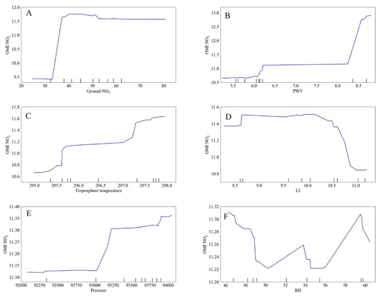 Figure 8 is the partial dependence plot (PDP) of the impact of each influencing factor on the NO2 column concentration in March 2019 by using the important parameters obtained through the importance interface. By using this PDP and multiple linear regression, we can establish the conditional function relationship specific to air pollutants.