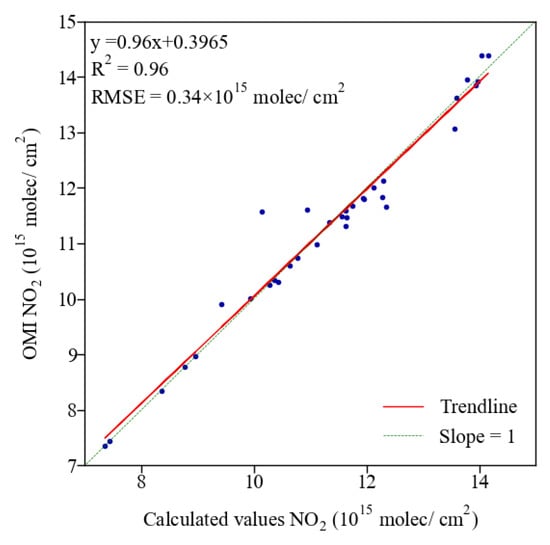 The results of the calculation of the No2 column concentration for March 2019 based on the obtained functional relationship are shown in Figure 9. It can be seen that the results are very close to the measured values of OMI with a trend line slope of 0.96 R2 of 0.96 RMSE of 0.34 × 1015 molec/cm2. It can be proved that the obtained functional relationship can describe the relationship between the influencing factors and the NO2 column concentration.