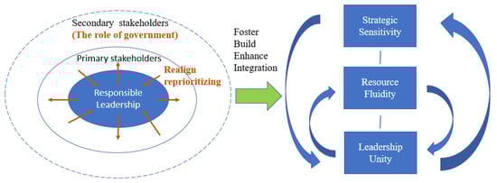 Strategic agility refers to firms that can continually respond to a changing environment by making necessary strategic moves [37]. This definition of strategic agility is more comprehensive as it progressed on the definition in [38] that strategic agility is having the ability to avoid collusions by altering direction, and rapidly recognizing and seizing opportunities. Furthermore, under this framework, strategic agility refers to the ability of an organization to continuously adjust strategic directions and thrive with innovative ways to create value. More specifically, according to [37], strategic agility is not about responding to a particular crisis but about encompassing the ability to adapt to changes in order to maintain competitive advantage. Strategic agility comprises three meta-capabilities: strategic sensitivity, resource fluidity, and leadership unity [39]. We propose that, during challenging times, responsible leadership, in fact, helps to foster, build, enhance, and integrate all meta-capabilities of strategic agility. The current research presents novel and original empirical evidence for the impact of responsible leadership on business survival and recovery during crises by enabling and integrating all aspects of the strategic agility of an organization.