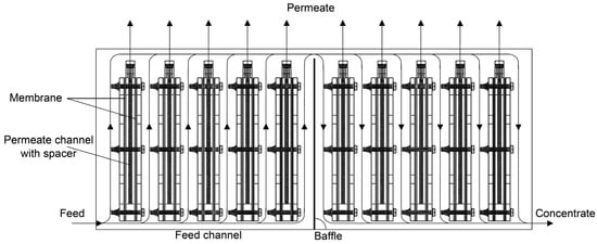 Details of plate-and-frame membrane specifications are summarized in Table 1, and the schematic of the plate-and-frame module and filtration membrane system is shown in Figure 8.