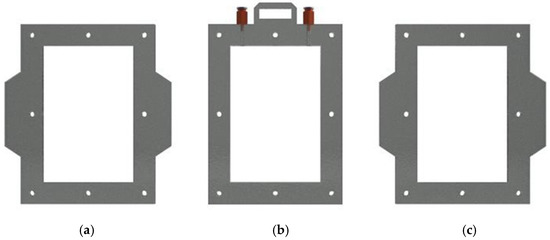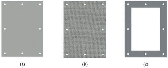 The active area of the membrane sheet and spacer sheet was 85 × 128 mm (Figure 3a,b). The silicon rubber had a similar size, but only in the perimeter of the plate (Figure 3c). The membrane element configuration was as follows: front plate–silicon rubber–membrane sheet–spacer–silicone rubber–middle plate–silicon rubber–spacer–membrane sheet–silicon rubber–rear plate (Figure 2c).