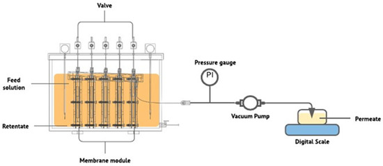 The plate-and-frame module was used to clarify the orange juice. Orange juice was obtained from a local farmer in Malang city, East Java, Indonesia. The juice clarification was conducted under dead-end mode, with a suction pressure of −0.2 bar, a feed volume of 12 L, and 2 membrane elements (4 membrane sheets). The schematic diagram of the orange-juice clarification process is shown in Figure 7.