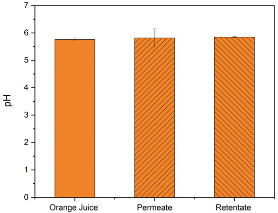 The pH of the feed (orange juice), the permeate, and the retentate streams.