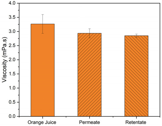 The viscosity of the feed (orange juice), the permeate, and the retentate streams.