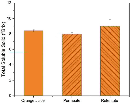 The total carbohydrates in the orange juice had the highest value in the soluble fraction of 76%, consisting of sucrose, glucose, and fructose (2:1; 1). It was known that the pore size of the membrane was larger than the molecular weight of the carbohydrate materials listed in Table 2, e.g., sucrose (342.30 Da), glucose (180.16 Da), and fructose (180.16 Da). Those carbohydrates were expected to pass through the membrane pore. In addition, the molecular weight of pectin and protein was around the pore size of the membrane; hence, they were partly rejected (up to 90%) and accumulated in the retentate stream. Another study reported that the °Brix value of an orange juice increased by a factor of two by ultrafiltration and increased from 24 to 65 °Brix when using a direct contact membrane distillation [58]. The °Brix of a clarified fruit juice can reach 25–30 through a concentration process, using a reverse-osmosis membrane [59]. The increase in total soluble solids also occurred due to reduced water content due to the clarification process with the membrane. The °Brix in the clarified Valencia orange juice via ultrafiltration decreased slightly [21]. The soluble solids in the clarified orange prickly pear juice with ultrafiltration membrane increased from 10.8 to 11.4 °Brix [20]. Pomelo fruit has a total soluble solids value of 7.14–9.10 °Brix [38].