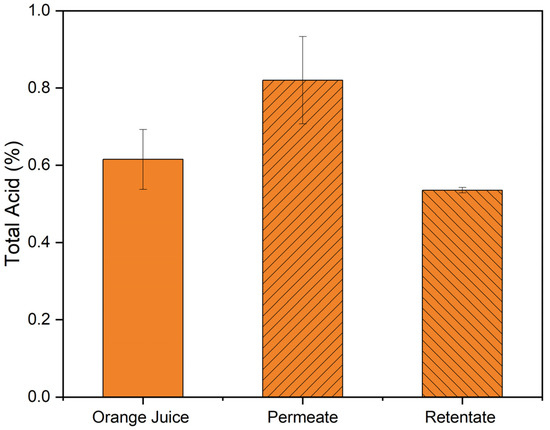 The decrease in the total acid value of the retentate in this study was attributed mainly to acids with small molecules thoroughly permeating through the membrane and that were probably neutralized or oxidized. For instance, the total acid decreases under prolonged heating at high temperatures due to the oxidation of ascorbic acid. The total acid value (represented by citric acid) was about 0.54%, exceeding the minimum acidity content in orange juice, i.e., 0.35%. Total acid content can affect the pH and the taste [56]. The total acid content of orange juice increased with cyclodextrin and decreased with the addition of cellulose acetate. The acidity of fruit juices in some countries determines fruit ripeness because fruit color is an inferior and unreliable guide [40].