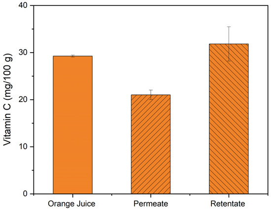 The vitamin C content in orange juice was expressed as ascorbic acid and was measured by using the titration method, as shown in Figure 13. The vitamin C content in the clarified orange juice was 31.85 mg/100 g, as the vitamin C content tends to increase in the retentate. Table 2 shows that the molecular weight of vitamin C (ascorbic acid) was 176.12 Da, slightly lower than the MWCO of the applied membrane of 210.14 Da. Partial retention of vitamin C was then expected and accumulated in the retentate. The formation of a dynamic membrane on the membrane surface enhanced the vitamin C retention.