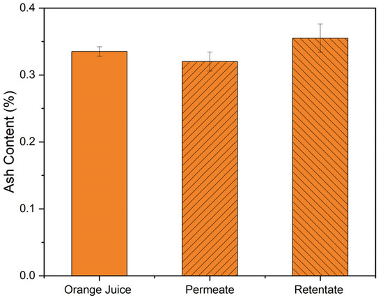 The ash compositions represent orange juice’s mineral content, and the analysis results are shown in Figure 15. The ash content slightly increased in the retentate could be attributed to a fraction of soluble solids retained by the membrane.