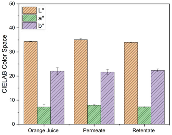 The CIELAB L*, a*, and b* color space of the feed (orange juice), the permeate, and the retentate stream.