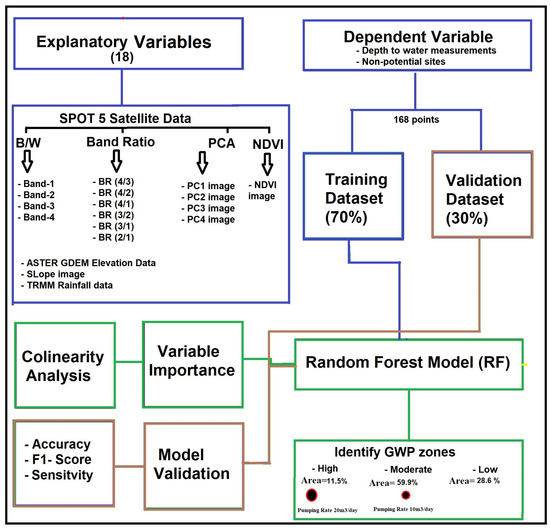 Figure 3 shows the various steps used to identify and map the groundwater potential zones in the study area. SPOT 5, TRMM, and ASTER GDEM raster data are processed to produce eighteen continuous raster features used as explanatory variables. The idea of performing the RF model using continuous raster data (raw and processed) instead of categorical classified data is to overcome the bias that arises due to differences in the variable’s data range. Image subsets from the original SPOT multispectral images were prepared and used as inputs in the RF model. Band ratio, PCA, and NDVI are the main image processing techniques used to generate the different datasets of the explanatory variables. ASTER GDEM elevation data are used to prepare the slope image. TRMM rainfall data are used in the model. A dependent variable (168 points) is collected and used in the RF model. These points are composed of depths to groundwater measurements and non-potential sites. It was split into 70% used for training the model and 30% for validation. The accuracy, F1_score, and sensitivity are all generated to test the model performance. The resulting groundwater potential map was evaluated using available pumping rate data. A Random Forest model was performed using the ArcGIS Pro package.