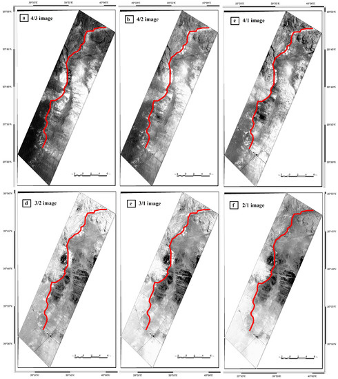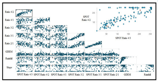 Collinearity is a statistical technique represents a linear relationship between two independent variables. It is performed before the RF model implementation. It can influence the performance of the model by adding noise to the outcomes [32]. Figure 8 shows the linear relationship between some selected variables of the study area. It shows no significant correlation between the explanatory variables except the linear positive correlation between: (1) band ratios 4/3 & 4/2 with R2 = 0.59; (2) band ratios 3/1 & 3/2 with R2 = 0.92; and (3) band ratios 3/1 & 2/1 with R2 = 0.8. Ref. [33] concluded that the R2 values between 0.4 and 0.85 are acceptable levels for correlation between two variables.