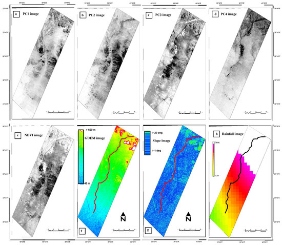 Explanatory variables (cont.): (a) PC1, (b) PC2, (c) PC3, (d) PC4, (e) NDVI image, (f) GDEM elevation data, (g) slope image, and (h) TRMM rainfall image.