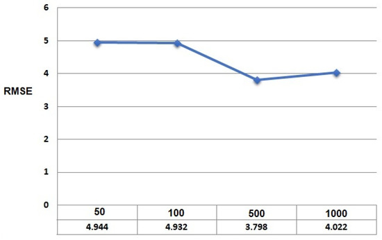 Table 3 shows the RF model characteristics (number of trees, leaf size, tree depth range, mean tree depth, number of randomly sampled variables, and the % of training data excluded for validation in addition to the out-of-bag errors). The default value of Minimum Leaf Size is (1). The maximum tree depth under the default number of trees ranges between 1 and 7. The default percentage of training available per tree is 100%. The number of randomly sampled variables is 4 and it specifies the number of explanatory variables used to create each decision tree. In the present study, 30% of training data was excluded for validation of the model. The default value for the number of trees is 100. The model runs more than one time with a different number of trees to reach the stability of the model. Figure 10 shows the root mean square error (MSE) values at different runs. It scores values 4.944, 4.932, 3.798, and 4.022 at 50, 100, 500 & 1000 trees, respectively. Generally, an increasing number of trees in the Random Forest model provide a more accurate model prediction.