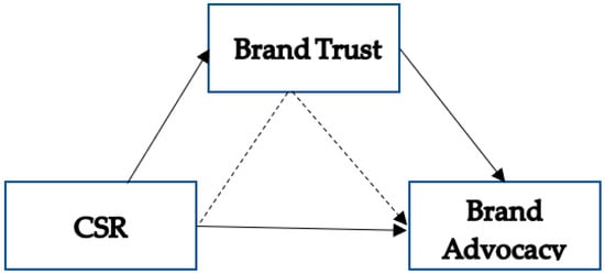 In today’s competitive business environment, it is essential for the corporation to build and maintain a socially responsible image in the stakeholder’s eyes since it is critical for their success [26]. Companies obtain a competitive advantage by having CSR activities and programs [28,29]. Many studies in the literature show a positive impact of CSR on consumers’ various relational and behavioral outcomes [12]. In the present study, we examine the influence of CSR on consumer brand advocacy in the banking sector in a developing nation. We argue that the relationship between CSR and brand advocacy may be mediated by brand trust. As mentioned above, a stronger CSR perception is anticipated to be associated with a higher level of brand advocacy from consumers because CSR perceptions may encourage consumers to form positive relationships with brands and strengthen the buyer–brand relationship, which can result in a variety of advocacy behaviors. This study also integrates the role of trust as a direct and indirect pathway from CSR to brand advocacy. The proposed framework is shown in Figure 1. Marketers can gain insights into fostering consumer advocacy behavior by comprehending the components influencing brand advocacy and the mechanism through which CSR initiatives influence brand advocacy.
