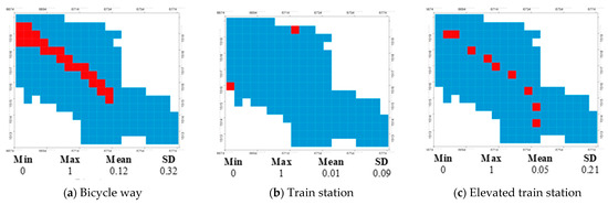 In this part, built-environment variables were assessed by cluster analysis for consideration of characteristics of the physical data. The clustering of built environments and satisfaction with QoLT based on chi-square allowed for geospatial visualization among different urban contexts. Figure 4 displays all built-environment variables by mapping via 500 × 500 grid cells. The color-temperature symbol represents the number per grid, the cool tones represent low values and the warm tones represent large values, with the unit being the number per grid, such as the number of bus stops per grid, the number of elevated train stations per grid, and the number of buildings on different grids.
