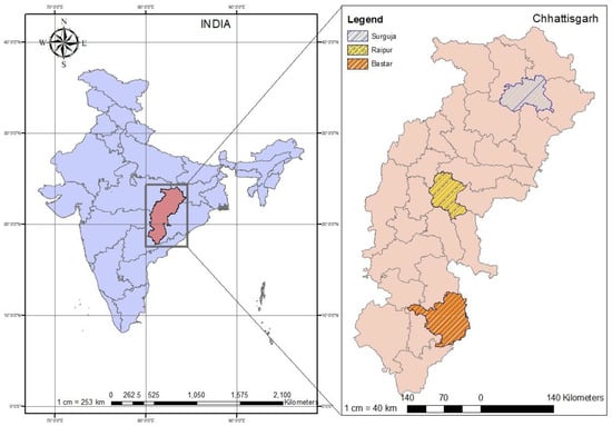 Among the districts of Chhattisgarh, three major districts representing three agro-climatic zones were considered in this study, i.e., Raipur (21°15′ N, 81°37′ E) from the Chhattisgarh plains, Surguja (23°6′ N, 83°11′ E) from the northern hills, and Bastar (19°4′ N, 82°1′ E) from the southern plateau (Figure 1).
