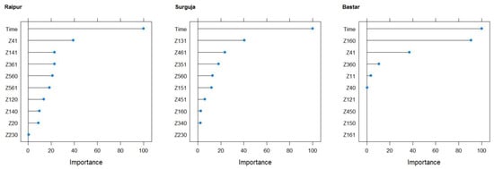 The results of the LASSO analysis revealed that the value of R2 ranged from 0.93 to 0.97. The highest R2 was observed for the Raipur district (R2 = 0.97), with a RMSE value of 0.069 t/ha, followed by Surguja (R2 = 0.94) and Bastar (R2 = 0.93), with RMSE values of 0.089 t/ha and 0.096 t/ha, respectively. On the other hand, in the validation stage, the R2 value ranged from 0.158 to 0.568. The highest R2 was observed for Bastar (R2 = 0.57), with RMSE 0.322 t/ha, whereas the lowest R2 was observed for Surguja (R2 = 0.158), with RMSE 0.235 t/ha. Moreover, at the validation stage, the performance of the LASSO model was good for Surguja (nRMSE = 16.08%) and fair for Raipur (nRMSE = 27.71%) and Bastar (nRMSE = 22.04%). Hence, the LASSO model can be used to forecast the rice yield for the Bastar district. Despite good model performance at the calibration stage, the MBE value indicated underestimation of the crop yield for the Raipur (MBE = −0.393) district and overestimation for Surguja (MBE = 0.193) and Bastar (MBE = 0.158) at the validation stage. The variable importance developed using LASSO is shown in Figure 3. During the calibration stage, MAE values were near to zero for all three locations (0.05, 0.07, and 0.08), suggesting excellent model performance, and during the validation stage, MAE values were found to be 0.39, 0.19, and 0.26 for Raipur, Surguja, and Bastar, respectively.