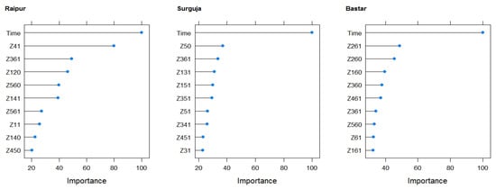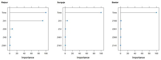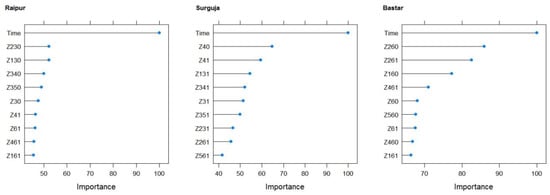 For ridge regression, at the calibration stage, the maximum R2 value was found for the Bastar (0.769) district, with a RMSE of 0.21 t/ha, and the minimum R2 was recorded for Raipur (0.715), with a RMSE of 0.25 t/ha. In addition to this, the value of the nRMSE showed good model performance (nRMSE < 20%) for all the districts. The RMSE statistic for the validations showed that the performance of the ridge regression model was good for Surguja (nRMSE = 19.978%), fair for Bastar (nRMSE = 20.130%), and poor for Raipur, (nRMSE = 44.633%). Contrary to this, at the validation stage, the value of R2 was good for Raipur (R2 = 0.80) and poor for Surguja (R2 = 0.01) and Bastar (R2 = 0.24). The MBE value indicated underestimation of the crop yield for all three districts of Chhattisgarh at the validation stage. The MAE values were found to be 0.18 for both Raipur and Surguja, and 0.19 for the Bastar district at the calibration stage. During validation, the MAE was found to be 0.91 for Raipur and 0.25 for both Surguja and Bastar, suggesting poor model performance. Therefore, overall, ridge regression is not a good choice to provide the rice yield forecast for all three studied districts of Chhattisgarh. The variable importance developed using ridge regression is shown in Figure 4.