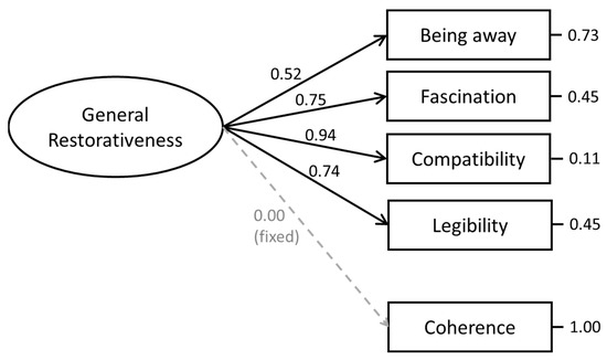 Internal consistency was good in each of the five domains of restorativeness. Being away: alpha = 0.87; fascination: alpha = 0.86; coherence: alpha = 0.77; compatibility: alpha = 0.90; and legibility: alpha = 0.83. A single-factor model with the five domains had very good fit indices, χ2(5) = 0.97, p = 0.97, RMSEA = 0.00, SRMR = 0.01, CFI = 1.00, NNFI = 1.02, AIC = 7798.49, and acceptable reliability, omega = 0.78. However, the standardized loadings were not all optimal: for being away, std.B = 0.52; for fascination, 0.74; for coherence, −0.04; for compatibility, 0.94; for legibility, 0.74. Therefore, coherence seems unrelated to the general restorativeness. Fixing the coherence loading to zero, thus considering it as a separate aspect of restorativeness, led to similar fit indices, but improved reliability for the latent factor and a better (i.e., lower) AIC: χ2(6) = 1.27, p = 0.97,RMSEA = 0.00, SRMR = 0.02, CFI = 1.00, NNFI = 1.02, AIC = 7796.78, omega = 0.83. Thus, we retained the latter solution as the best one, with a latent factor for restorativeness provided by being away, fascination, compatibility, and legibility. On the contrary, coherence was examined separately. The final factorial solution is shown in Figure 2.