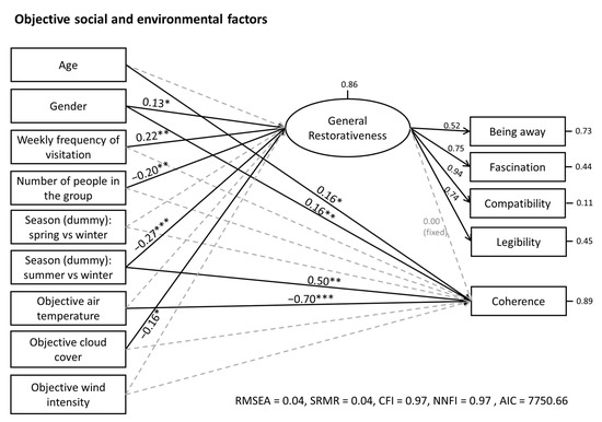 We decided to create two distinct models to predict restorativeness based on objective, social, environmental, and perceived environmental factors. A structural equation modelling (SEM) approach was adopted to provide a comprehensive picture of the predictors of restoration, which simultaneously considers the overall adequacy of the model’s standardized fit. A step-AIC procedure was employed to identify the set of predictors in the best-fitting model. With this exploratory procedure, starting from the full model (with all regression paths being estimated), all the alternative models are estimated at zero for one regression path at a time until the AIC cannot be lowered further. “Gender” (treated as a factor) and “age” (treated as a continuous variable) were always entered in the initial models as possible control variables. For the objective, social, and environmental factors, the predictors tested in the linear model included the following: weekly frequency of visits, number of people in the group, season (with two dummy-coded variables: springtime vs. winter and summer vs. winter), objective air temperature, objective cloud cover, and objective wind intensity.