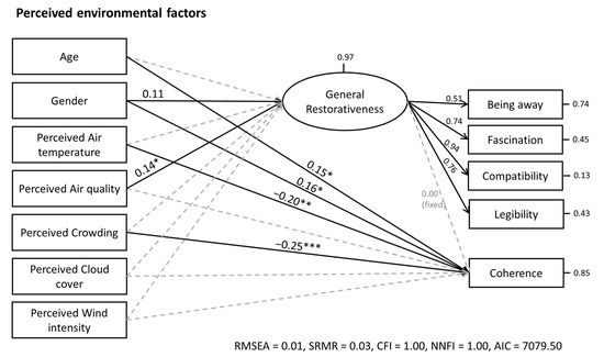 The final best-fitting (lowest-AIC; N = 233) model included regressions from the following predictors: For general restorativeness: gender and perceived air quality (final R2 = 0.03). For coherence: age, gender, perceived air temperature, and perceived crowding (final R2 = 0.15). AIC of initial model = 7090.85, AIC of final model = 7079.50. Standardized fit indices were very good, χ2(35) = 35.32, p = 0.45, RMSEA = 0.01, SRMR = 0.03, CFI = 1.00, and NNFI = 1.00. Figure 4 below shows the final model with standardized coefficients.