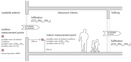 As SARS-CoV-2 infections spread around the world in 2020, the pandemic forced governments and regulatory institutions to declare a crisis and implement dramatic measures to combat the spread of the virus, with impacts on society and the economy [1,2]. With each new variant of mutation, the number of viral infections fluctuated, causing changes in the restrictions on public life to control the pandemic. These restrictions fell onto the school system, and so the schools had to adapt to the new recommendations and protocols that were developed by the national health institutions [3], to try to ensure a safe environment in classrooms. The scope of these restrictions varied temporally and regionally; however, all covered measures of preventing infections with similar respiratory viruses causing severe acute respiratory syndrome (SARS). These included the mandatory use of masks, maintaining social distance between pupils and staff, protocols of cleaning and disinfection, ensuring the hygiene of hands and coughing, and providing appropriate ventilation [4]. In Spain, natural ventilation was prioritised over mechanical ventilation, and special measures were applied to the use of mechanical ventilation [5]. The recommendations for controlling a SARS outbreak indoors suggested ventilating at least at the beginning and the end of each class, during the break and, if possible, during the class as well. The effectiveness of these measures in schools was proven [6], although not all schools ventilated their classrooms in the same manner. Early on during the outbreak of COVID-19, as new health measures were implemented in schools, studies focused on the assumption of a possible relationship between the spread of the SARS-CoV-2 virus and the presence and concentration of airborne particulate matter (PM10 and PM2.5) [7]. The rapid spread of the virus in the Italian city of Bergamo in 2020 prompted researchers to first look into the possibility of measuring PM10 particles as early indicators of transmission of the SARS-CoV-2 virus [8]. The deposition of viruses and bacteria has already been proven to be associated with aerosols and particle matter, particularly those greater than 0.7 μm in size [9], as viruses and bacteria are usually not dispersed in the air as free particles [10,11]. In a similar way to how CO2 can be considered to be an indicator of indoor pollution [12,13], PM can be used to indicate the potential spread of COVID-19 in the air, and high levels should trigger remedial action to reduce the risk of infection [14]. Comparably, Lelieveld et al. [15] found aerosolised particles to effectively transmit COVID-19 in indoor environments. A study investigating the IAQ in primary school classrooms [16] found that closing windows and doors could only partially prevent outdoor PM2.5 from infiltrating indoors, as the indoor concentrations of PM2.5 fell to only 60–70% of the comparative outdoor concentrations. Many issues can impede adequate ventilation in classrooms.