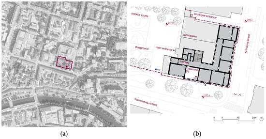 (a) Location 2 within the city centre and school ground area. The location of the classroom is marked with a dot (source: Google Earth, 28 April 2022). (b) School floor plan.