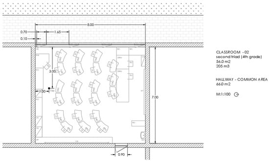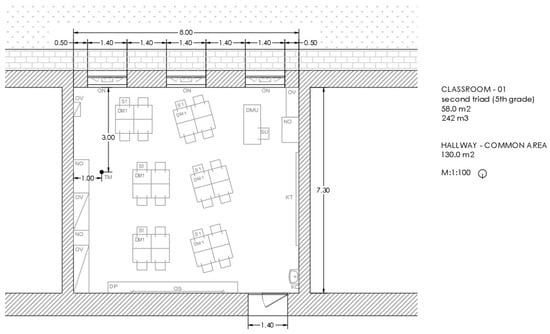 The classroom has a square floor area of 58.0 m2, or 2.41 m2 net area per pupil (Figure 3). It features three window alcoves, each with a radiator heater and a windowsill above. In the upper part, there are window blinds, which were raised at the time of the measurements. The windows open via two sashes in the bottom row and the top row on a tilt. The windows that open to the stile provide a total of 2.52 m2 of open area. The windows opening on the upright side provide a total of 1.35 m2 of open area. At the time of the measurements, two windows were fully opened at every school hour. A window was also kept open at the teacher’s seat at all times. The windows were then closed quickly, in less than one minute, because of the winter temperatures outside. The door was only opened during breaks; however, the children stayed in their classroom, leaving only during sports education and following the last lesson. The absence of students for sports class occurred on 22 December 2021, from 12:00 to 13:00, and on 11 January 2022, from 11:00 to 12:00. The classroom had 6 groups of desks with space for 24 pupils, each sitting 0.5 m from one another (Figure 3). The door to the classroom opens into a common room or corridor connected to the main core of the building and a staircase. The ceiling is 4.15 m high, and the room has a volume of 240.7 m3, or 10.03 m3 per pupil. The classroom has wooden parquet flooring and plastered brick walls. At the time of the measurements, the occupancy of the classroom fluctuated between 22 and 24 pupils.