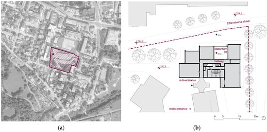The school building of location 2, on the other hand, is only two stories in height, at 9.9 m, and marks one of the quieter and greener locations in the city. The school is separated between three buildings, with the newest wing built in 1976, where the measurements were carried out. The structure is made of reinforced concrete. Similar to the UC school, the first floor has classrooms for first- and second-grade pupils, while the upper floor is dedicated to the classrooms of older pupils. It is set in a quiet urban background but remains within the innermost urban ring, close to the old town (Figure 4a). Due to the urban morphology surrounding the school, the nearby local street does not have the character of a street canyon, with two-way infrequent traffic and a speed limit of 30 km/h. The surrounding space is open and airy. The view from classroom 2, where the measurements were taken, opens out into this area, along with all the windows in the classroom (Figure 4b).