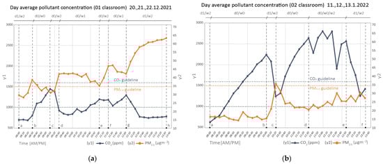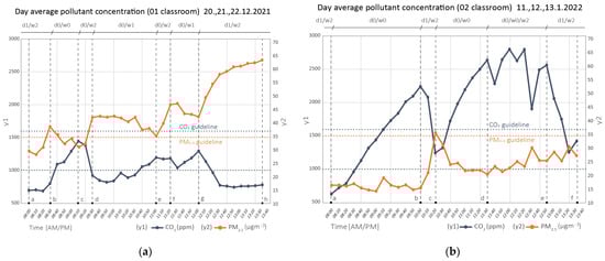 Measured pollutants as CO2 (ppm) and PM2.5 (µgm−3) in 34 datasets. Dashed lines correspond to safe levels of CO2 (UL RS, 42/02, 105/02, 110/02—ZGO-1 in 61/17—GZ) and PM2.5 [38] for the 24 h of exposure time. (a) Data for the days 20 to 22 December 2021 in classroom 1. (b) Averaged data for the days 11 to 13 January 2022 in classroom 2. Legend: CO2 (ppm), PM10 (µgm−3), PM2.5 (µgm−3), d0/w0—doors and windows closed, d0/w1—doors closed, and windows only tilted open, d0/w2—doors closed and windows turned open, d1/w2—doors and windows turned open.
