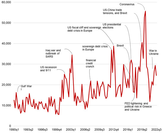 World Uncertainty Index (1990Q1 to 2022Q3). Source: Ahir, Bloom, and Furceri [10].