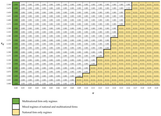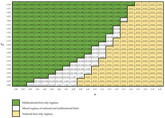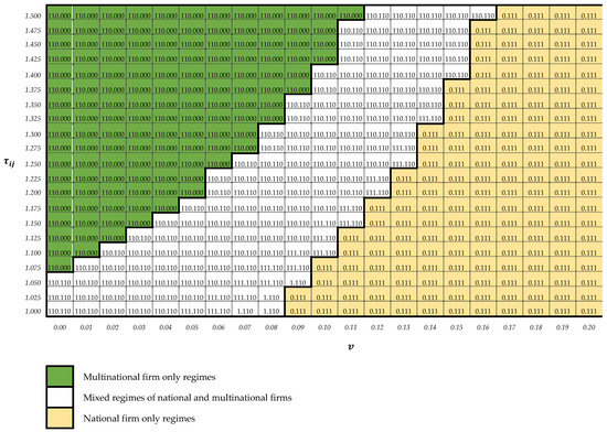 The numbers inside the box indicate the emergence of each firm type: {100, 10, 1, 0.1, 0.01, 0.001} are associated with {, , , , , }, respectively. For example, in the northwest corner in which and , , , and are active (denoted by 111.000). In such a way, Figure 2 displays all the equilibrium regimes with different values of and . In general, we can distinguish three different areas: multinational firm only regimes (colored in green), mixed regimes of national and multinational firms (colored in white), and national firm only regimes (colored in yellow).