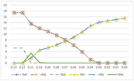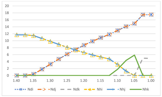 Figure 5 shows first the effects of trade liberalization between country i and j when . As falls from 1.4 to 1.0, and increase, while and decrease. At the end, and emerge too, due to the exit of and .