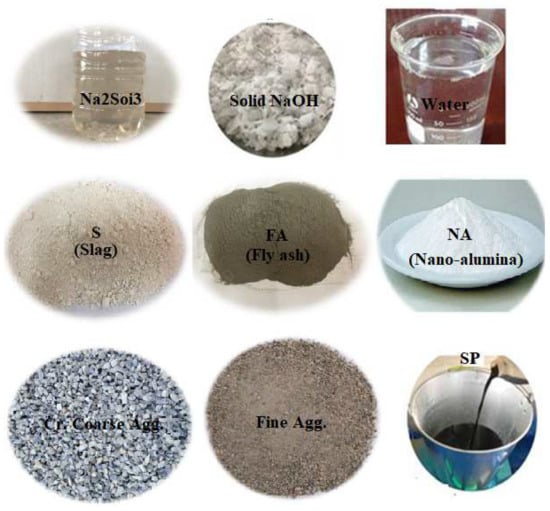 A-ASCC is a type of liquid concrete that can be set and consolidated by weighing it without mechanical vibration. In the current study, locally available low-calcium fly ash from Euro build and ground-granulated blast slag from Chine confirmed to meet ASTM C 618 standards [44]. Complementary uses of slag and fly ash produced more promising performance than alkali-activated concrete based on fly ash [45], because the mineral composition of the material is directly related to the development of strength. Slag and fly ash include considerable amounts of SiO2, CaO, and Al2O [45]. Slag was used with a specific gravity of (2.7) g/cm3 and a specific surface area of (418) kg/m2. Furthermore, the effect of nano-alumina (NA) on a wide scale and in the present period was explored as part of the research. Locally available nano-alumina (gamma) with 99.9% purity is used as a nanomaterial additive. Furthermore, the particle size of both nanomaterials is in the range of 20–30 nm with a specific gravity of 2.2 g/cm3. The amount of nano-alumina used was 0.5, 1.0, and 1.5 percent of the binder total weight [46]. Furthermore, two different pozzolans (slag and fly ash) were used to investigate the influence of NA on the SCC’s mechanical strength in order to analyze the effect of nanoparticles on mechanical and physical properties. Figure 1 shows the materials used in the production of A-ASCC mixtures. The physical characteristics and chemical compositions of S, NA, and FA obtained from the supplied company are shown in Table 1 and Table 2.