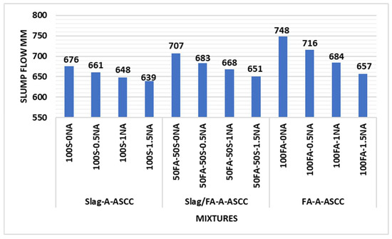 Figure 3 illustrates the slump flow values for each mix. As a result of the high surface area of NA particles, the mix with 100% FA and no NA had the greatest flow ability, whereas the mix with 100% slag and 1.5% NA had the least flow ability. The results revealed that including 1.5 percent NA reduced the flow ability of the slag-based A-ASCC mixtures marginally. Slump values and flow ability were significantly reduced with the addition of NA to the 100% FA and/or 50FA-50%S based A-ASCC mixtures. However, all mixtures performed well in terms of flow ability without bleeding or segregation, and the values were within the European Committee’s standards [50]. As a result, alkali-activated self-compacting concrete (A-ASCC) may be concluded to be useful for structural applications such as slabs, columns, and beams. The inclusion of NA also greatly enhanced the viscosity and cohesion of the mixes, and the mixes with NA were more homogeneous and flowed without separated aggregate and/or bleeding. Previous research on conventional SCC found that using nanoparticles reduced the slump flow value when produced with FA-mix (control mixes). This is due to the fact that flow values decreased as a result of high-surface-area nanomaterials absorbing some of the mixed water. Because of their huge surface area and strong reactivity, water molecules are drawn to nanoparticles. As a result, less free water is needed to increase the mix’s flowability [60]. However, the use of 0–1.5% NA with 50% FA and 50% slag was shown to have a high effect on the fresh properties of A-ASCC [61].