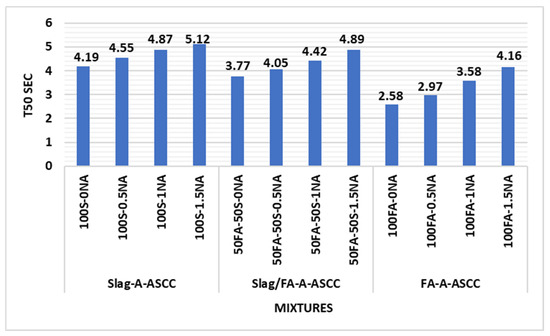 The T50 times of the A-ASCC mixes are shown in Figure 4. The mixtures with 0% NA and 100% FA had the shortest T50 duration. The mix with 100S-1.5% NA has the maximum flowability. At the same time, the T50 time for the 100% FA mixtures was higher than the T50 time for the 100% slag mixes. As illustrated in Figure 2, the mix with 100% slag and 1.5% NA had the greatest T50 time and the lowest flowability. Moreover, due to the high viscosity of the mixes, including NA, the T50 durations were significantly reduced, independent of the type of binder used. Additionally, in the study in hand, the T50 time was less than 6 s, which is in compliance with EN 12350-8 [57]. While this was going on, all T50 values in the current investigation were considered appropriate by the EN 12350-8 standard [57] and EFNARC specification [50]. Additionally, it was concluded from the T50 duration data that the amount of NA had a detrimental impact on the flowability of A-ASCC; mixes containing 100% fly ash without NA had shorter T50 durations.