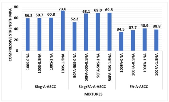 The compressive strength values and hardened performance of the A-ASCC specimens are shown in Figure 7 and Table 7. According to the results, the addition of NA had a superior influence on the compressive strength values of A-ASCC specimens. The improvement was obtained for the specimens containing 1% NA, which exhibited a 20% improvement over the mixes without NA.