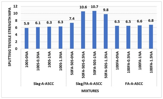 The effects of NA incorporation and the type of binder materials on the splitting tensile strength values of cylindrical self-compacting concrete specimens are depicted in Figure 8. The testing research found that nano-aluminum played an important role in enhancing splitting tensile strength, independent of binder type. The inclusion of NA improved the splitting tensile strength of 100 slag-based A-ASCC, with improvements of 6.9, 5.8, and 3.6 for the mixes containing 1.5%, 1%, and 0.5% NA, respectively. On the one hand, the results showed that increasing the NA concentration enhanced the A-ASCC specimens’ splitting tensile strength. Furthermore, the study indicated that 1.0% of nano-aluminum, 50% of slag, and 50% of fly ash had a tensile strength of 10.695 MPa with an improvement ratio of approximately 45.5%. The results showed that 1.5% nano-aluminum with 100% fly ash was 6.795 MP, with an improvement ratio of roughly 4.7%. The splitting strengths of slag-based A-ASCC containing 1.5%, 1%, and 0.5% NA were 7, 6, and 4%, respectively. The improvement ratios for 50FA/50S-based A-ASCC were 33, 44.5, and 44 for mixes including 1.5%, 1%, and 0.5% NA, respectively. The improved ratio for 100% FA-based A-ASCC was 4.7, 1.6, and 0.7 for the mixes including 1.5%, 1%, and 0.5% NA, respectively. Similar results were obtained in the previous studies for alkali-activated mortar studied by Shaikh et al. (2019) [65]. According to the results, the best binder materials to incorporate NA were 50% FA and 50% slag. As a result, the binder containing 50% FA and 50% slag produced the best reaction between the NA particles and the matrix. For all mixtures, the best and most cost-effective NA ratio was 1%. Previous research showed that nano-Al2O3 and nano-TiO2 doses of 0.5% and 1% by weight of cement were the most successful mixtures. Furthermore, as compared to the control conventional concrete, compressive, splitting tensile, and flexural strengths improved by 42%, 34%, and 28%, respectively [66].