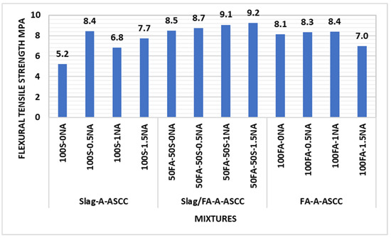 The flexural tensile strength of alkali-activated self-compacting concrete prisms was investigated. Flexural tensile strength testing was carried out on 100 × 100 × 500 mm identical prism specimens using a three-point bending load with a 3000 kN capacity (digital machine control). As illustrated in Figure 9, the testing results indicate that nano-aluminum had a significant effect on enhancing flexural tensile strength independent of binder type. The incorporation of NA enhanced the flexural tensile strength, with the improvement of 100% slag-based A-ASCC being 48, 31, and 62% for the mixes including 1.5%, 1%, and 0.5% NA, respectively. On the one hand, the results indicated that increasing the NA concentration improved the flexural tensile strength of A-ASCC specimens. Furthermore, the finding showed that the maximum value of 9.24 MPa was obtained using 1.5% nano-aluminum, 50% slag, and 50% fly ash, with an improvement ratio of around 8.9%. The results indicated that 1.0% nano-aluminum with 100% fly ash was 8.39 MP, with an improvement ratio of roughly 3.4%. The flexural tensile strength of slag-based A-ASCC containing 1.5%, 1%, and 0.5% NA was 48, 31, and 62%, respectively. For FA/S-based A-ASCC, the improved ratios were 8.9, 6.7, and 2.9 for the mixes containing 1.5%, 1%, and 0.5% NA, respectively. The improved ratio for FA-based A-ASCC was -0.85, 3.4, and 2.7 for the mixes containing 1.5%, 1%, and 0.5% NA, respectively. Similar results were obtained in the previous studies for alkali-activated mortar studied by Shaikh et al. (2019) [65]. According to the findings, the maximum flexural tensile strength was obtained with the utilization of the binder (50% FA and 50% slag), and the best binder materials to contain NA were 100% slag. That is, the binder containing 100% slag caused the greatest reaction between the NA particles and the matrix. For all mixtures, the best and most cost-effective NA ratio was 1%. A previous study found that nano-Al2O3 and nano-TiO2 dosages of 0.5 and 1% by weight of cement were the most efficient mixtures. Furthermore, as previously stated, as compared to the control specimen, compressive, splitting tensile, and flexural strengths increased by 42%, 34%, and 28%, respectively [66].