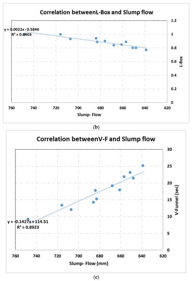 The researcher should also identify a correlation between the experimental data in order to evaluate the results. As previously stated, the compressive strength values of concrete have a considerable influence on its mechanical properties. This research focused on the relationships among fresh properties. There was a significant correlation between slump flow and T50 flow time, as illustrated in Figure 10a–c. (R2: 0.9114). There were also excellent relationships between L-Box and slump-flow (R2: 0.8403). In addition, there was a semi-strong correlation between slump flow and the V-funnel (R2: 0.8371).