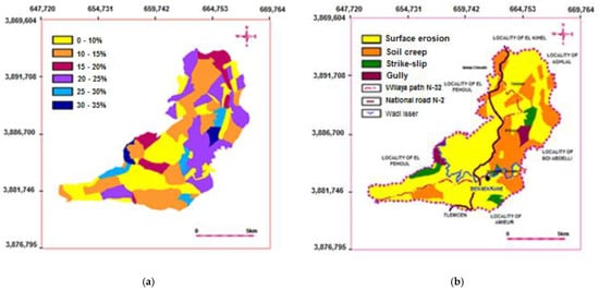 The municipality is characterized by slightly raised but uneven ground with slopes varying from 0 to 30%. It is hilly and sometimes has abrupt breaks around the marble quarries with slopes between 30 and 35%. The map shows the distribution of slopes in the commune of Bensekrane [24] (Figure 2a). The map of the slopes was made from a topographic map using MapInfo GIS. Furthermore, slopes were divided into 6 classes, because the limit slope, equal to 33%, was calculated by the stability calculation code FLAC2D [14,15]. According to Farès [37], the indices of the slopes were given by the values IP = 1 for 0–10%, 10–15%, 15–20%, 20–25% and 25–30% because these intervals were lower than the limit slope calculated by the FLAC2D software. IP = 2 for 30–35%, 3 for 35–55% and IP = 4 for >55%.