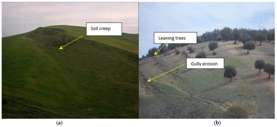 The areas indicating soil instability, such as surface erosion, gully erosion, soil creep and strike-slip faults, were prepared using MapInfo GIS [39] in vector mode. Figure 2b [15] shows the instability indicators present in the study area. The signs of instability present allowed us to map the instability indices given in Figure 3.